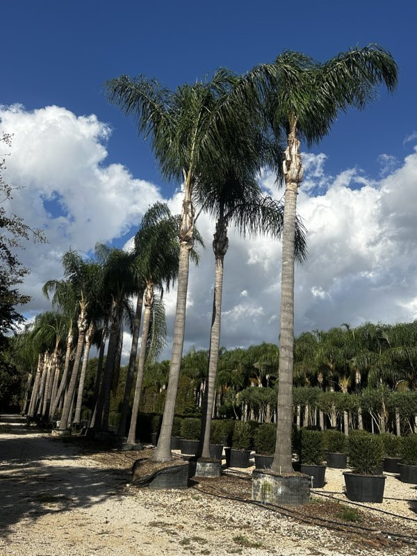Elegant Queen Palm (Arecastrum romanzoffianum, also known as Syagrus romanzoffiana). Features graceful arching fronds and smooth gray trunk. Fast-growing tropical palm, ideal for warm climates. Tolerates brief cold down to -5°C. Produces decorative orange fruits. Perfect for avenues, gardens, and large landscapes. Low maintenance and drought-tolerant once established.