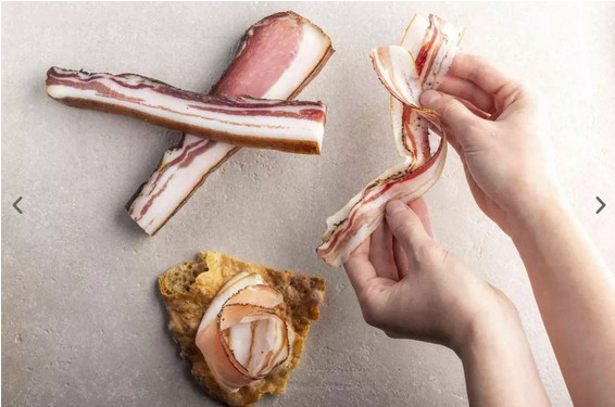 To produce our speck di mezzena, we select only the best parts of the mezzena, belly, and loin. Salted and spiced by hand according to tradition, it is then smoked with beech wood and juniper berries and finally aged for months in the aromatic Alpine air. After drying, it is aged in the cellars using stoves.