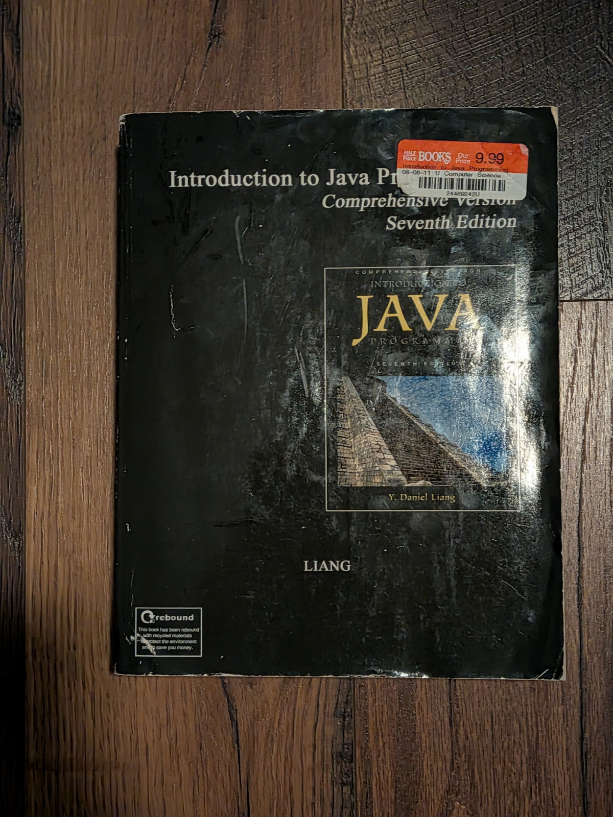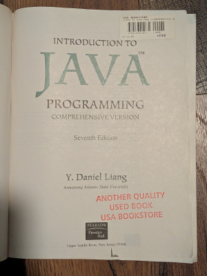 A very used copy of the comprehensive version of "Introduction to Java Programming" (7th edition) by Y. Daniel Liang. This copy has stickers on the spine, covers, and one inside page, significant edge wear, but no marks or highlighting on pages.