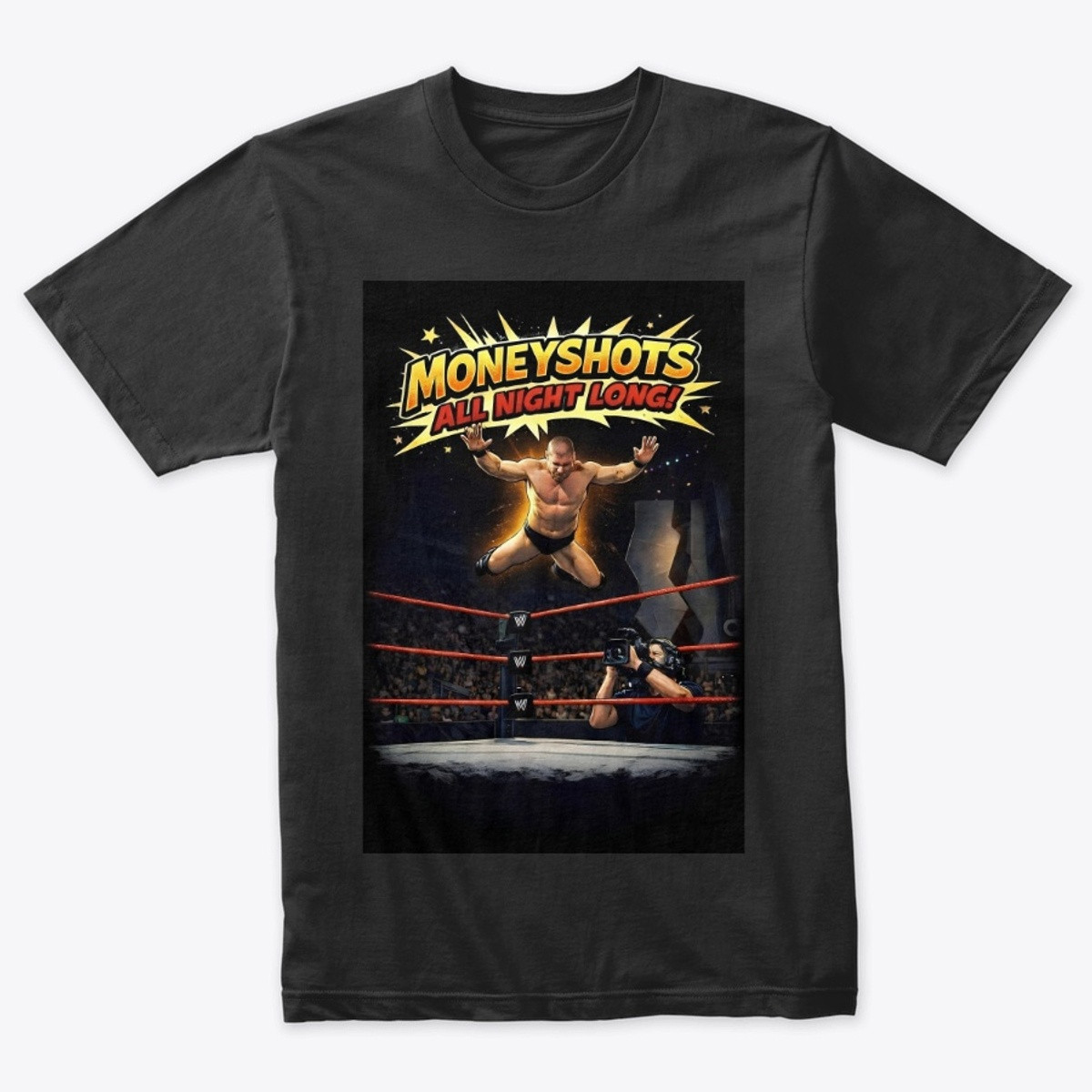 This bold black t-shirt pays tribute to the Attitude Era's most provocative superstar, Val Venis, with a high-flying, tongue-in-cheek twist on his infamous "Moneyshot" finisher.