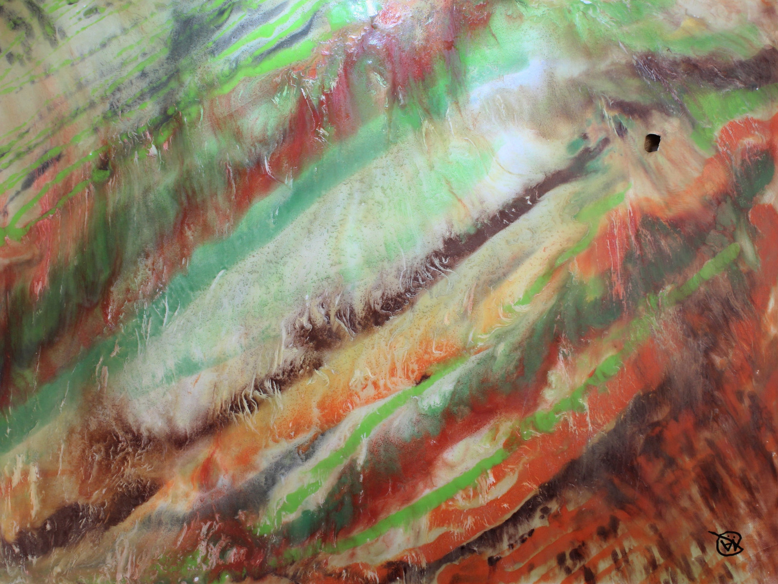 Original abstract acrylic pouring painting on canvas, finished with a glossy resin layer that enhances depth, color intensity, and texture. This large-format piece features dynamic, flowing bands of earthy browns, warm reds, and vivid greens, interwoven with soft whites and translucent gradients.