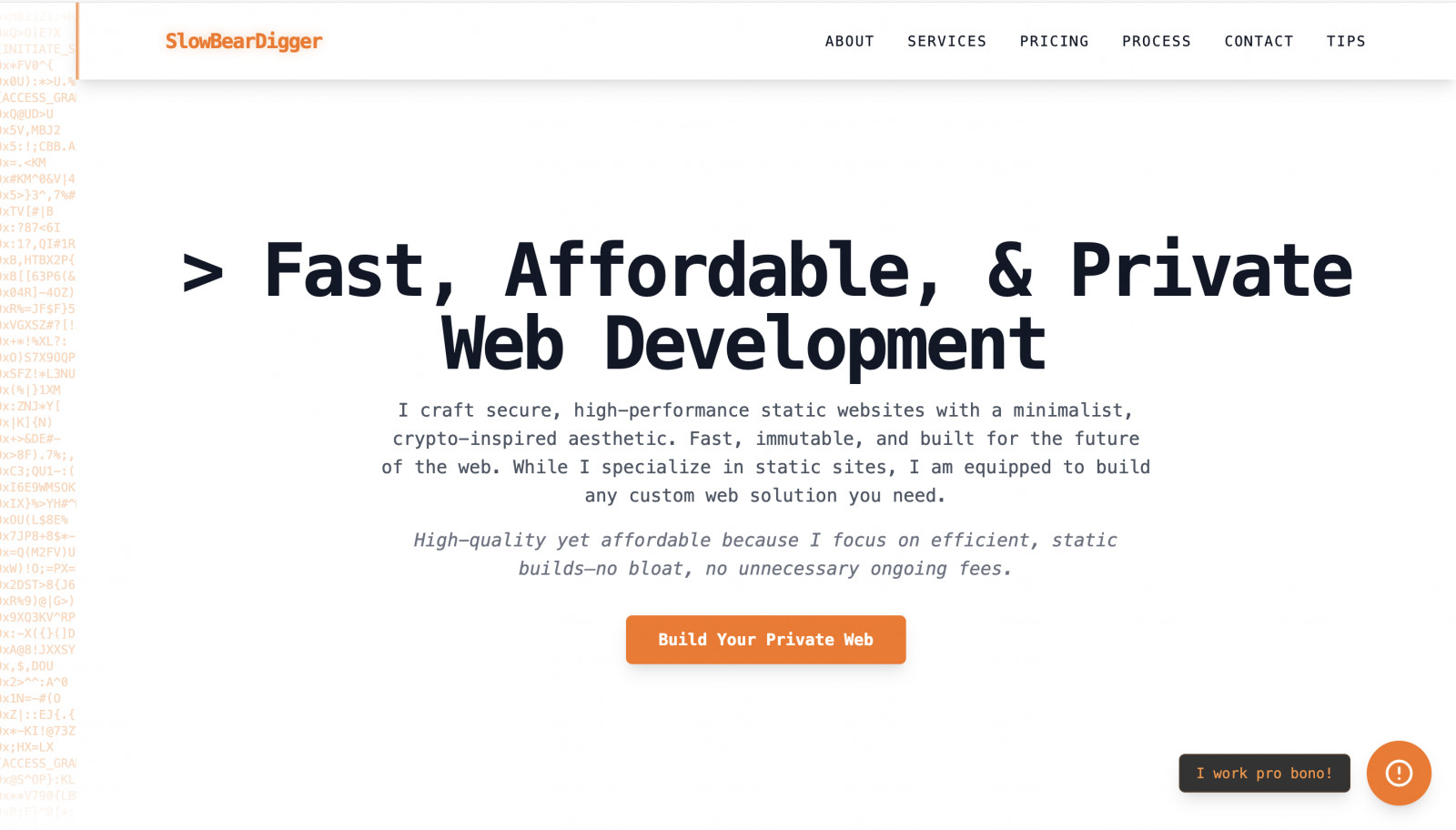 I'm SlowBearDigger, an anonymous developer specializing in high-quality, affordable web solutions built on a foundation of privacy and security.