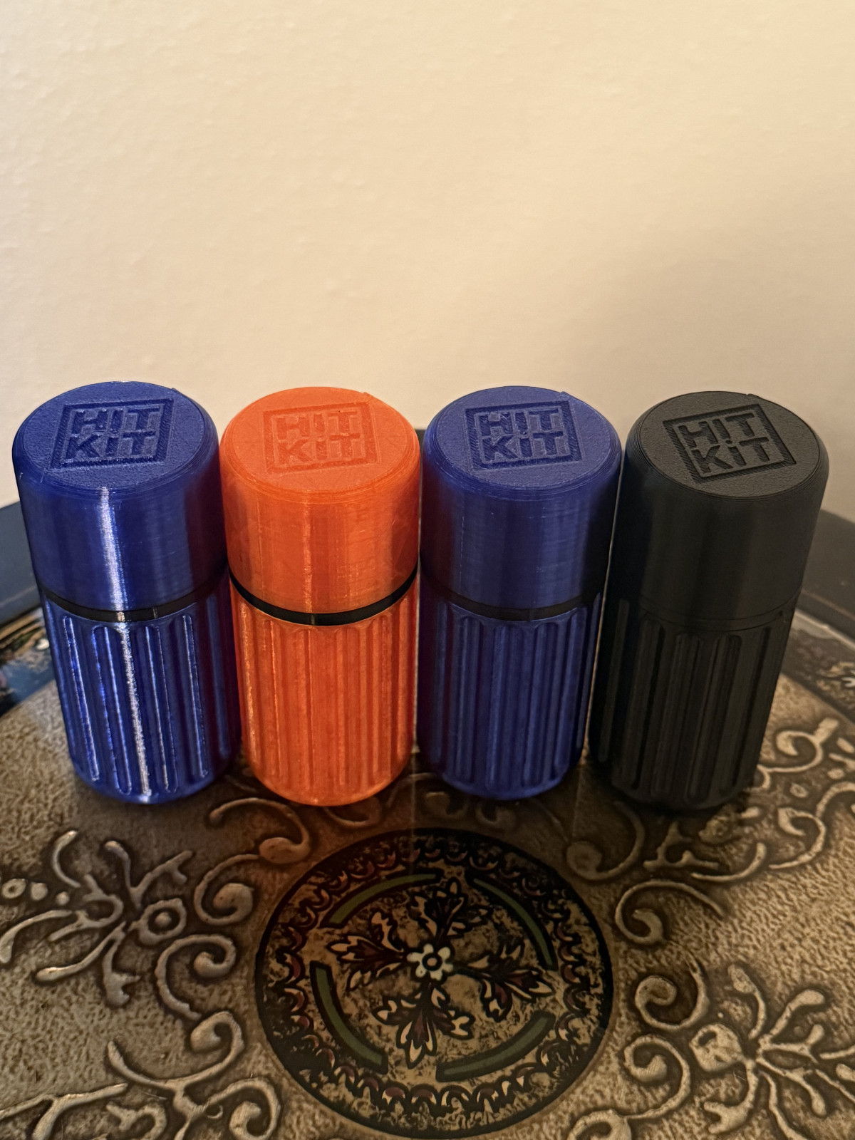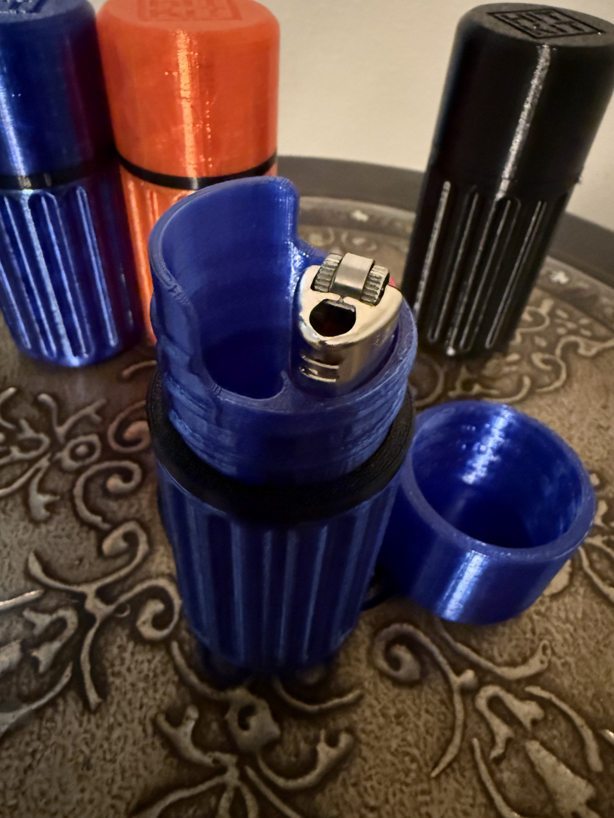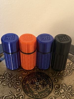 This is a 3D printed survival kit style "HIT-KIT" it has a space for a bic lighter built in. The main body and cap are PETG, the O ring is TPU. No metal.
