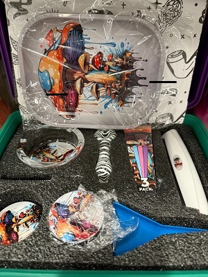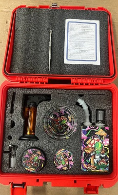 This is a 7-piece gift set with hard case cover that includes a water pipe, grinder, and other accessories. The set is handmade and comes in a multi color. It is designed in the United States and is designed for smoking enthusiasts.