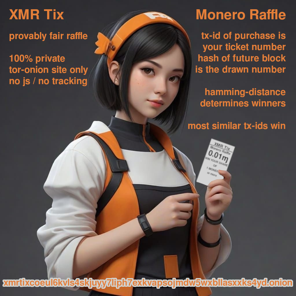 The ticket number you receive when you purchase a ticket is the transaction ID of your purchase! Furthermore, the raffle will take place when the prize money reaches 1 XMR meaning 100 tickets have been sold. When this milestone is reached, then the next block that is divisible by 5000 provides our winning number. After at least 10 confirmations, the block hash of this block is taken and compared with the participating transaction IDs using a "hamming distance" algorithm. The TX ID that is most similar to the block hash in this comparison wins category one; in the event of a tie between several participating transaction IDs, the prize money is shared. This is also the case in the other two price categories.